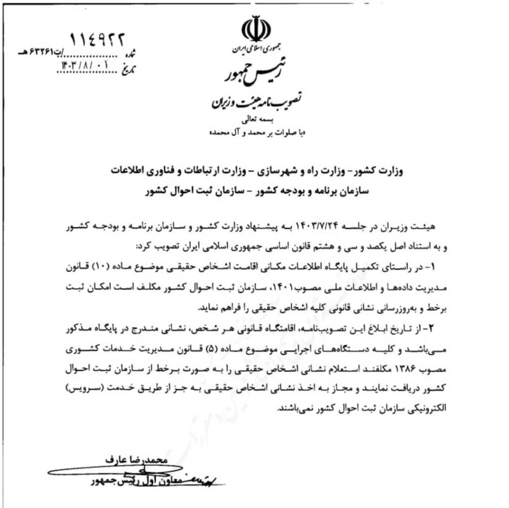 تصویب نامه هیئت وزیران در خصوص محل اقامت اشخاص حقیقی