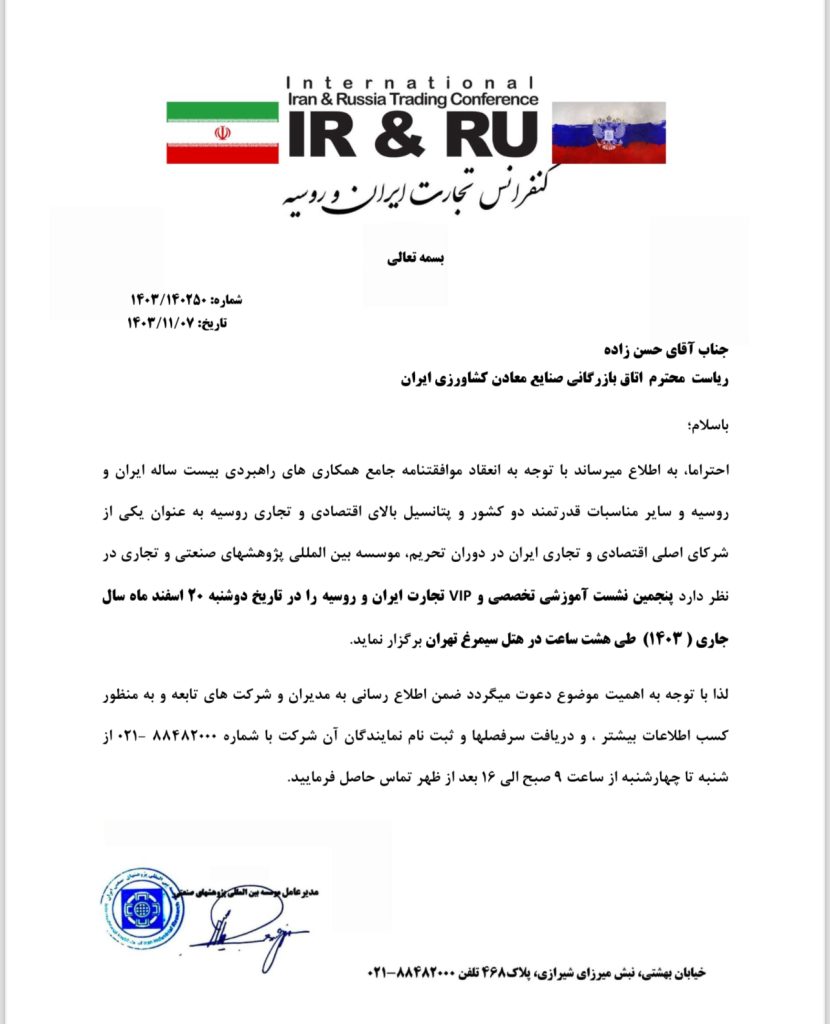 فراخوان پنجمین نشست آموزشی تخصصی و VIP تجارت ایران و روسیه