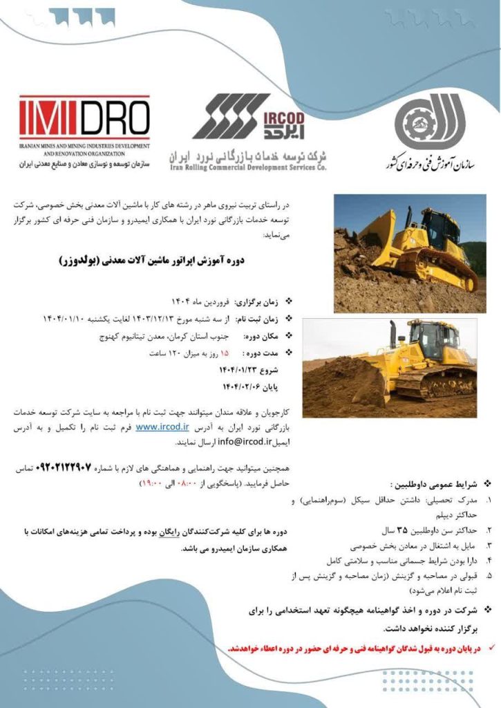 ثبت نام دوره آموزش رایگان کارور ماشینآلات معدنی (اپراتور بولدوزر) از سوی شرکت توسعه خدمات بازرگانی نورد ایران (وابسته به ایمیدرو) آغاز شد.