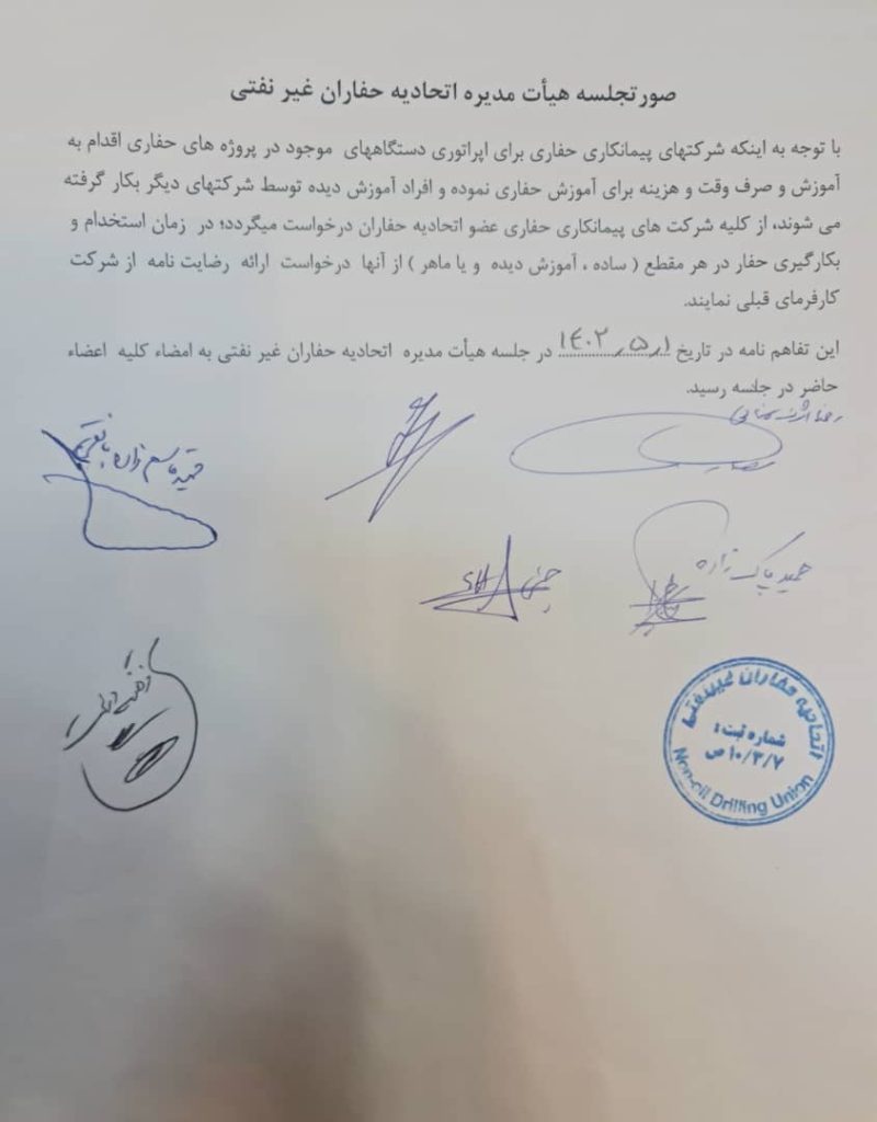 مصوبه هیأت مدیره اتحادیه حفاران غیرنفتی در خصوص استخدام حفار