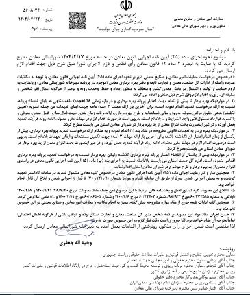 به گزارش معدن۲۴، در نامه «وجیه اله جعفری» آمده است: موضوع نحوه اجرای ماده (۴۵) آیین نامه اجرایی قانون معادن در جلسه مورخ ۱۴۰۴/۴/۱۷ شورایعالی معادن مطرح گردید که با عنایت به تبصره ۴ ماده ۱۲ قانون معادن رأی قطعی و لازم الاجرای شورا طبق شرح ذیل جهت اقدام لازم ارسال می گردد.