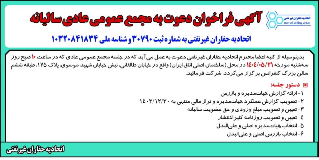 مجمع عمومی عادی سالیانه اتحادیه حفاران غیرنفتی مورخ ۱۴۰۴/۵/۲۱ برگزار میگردد