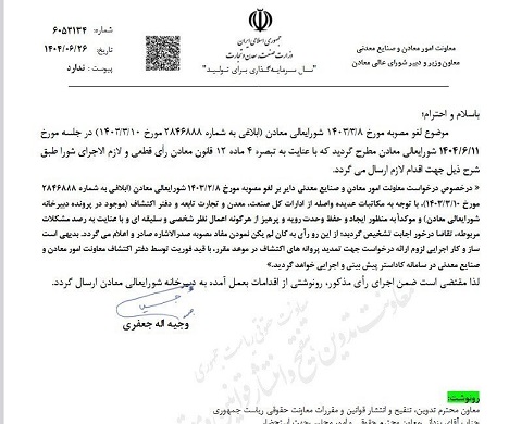 «در خصوص درخواست معاونت امور معادن و صنایع معدنی دایر بر لغو مصوبه مورخ ۱۴۰۳/۳/۸ شورایعالی معادن (ابلاغی به شماره ۲۸۴۶۸۸۸ مورخ ۱۴۰۳/۳/۱۰) با توجه به مکاتبات عدیده واصله از ادارات کل صنعت معدن و تجارت تابعه و دفتر اکتشاف موجود در پرونده دبیرخانه شورایعالی معادن و موکدا به منظور ایجاد و حفظ وحدت رویه و پرهیز از هرگونه اعمال نظر شخصی و سلیقهای و با عنایت به رصد مشکلات مربوطه، تقاضا در خور اجابت تشخیص گردید؛ از این رو رأی به کان لم یکن نمودن مفاد مصوبه صدرالاشاره صادر و اعلام میگردد. بدیهی است ساز و کار اجرایی لزوم ارائه درخواست جهت تمدید پروانههای اکتشاف در موعد مقرر با قید فوریت توسط دفتر اکتشاف معاونت امور معادن و صنایع معدنی در سامانه کاداستر پیش بینی و اجرایی خواهد گردید.»