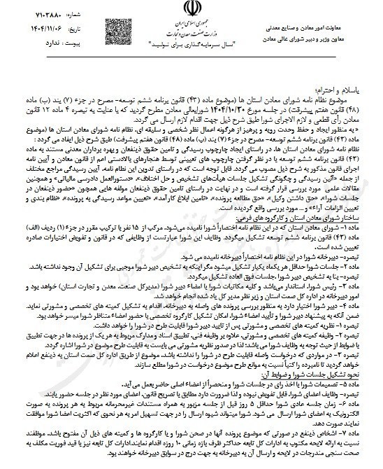 مصوبه شورای عالی معادن در خصوص نظامنامه شورای معادن استانها توسط دبیر شورای عالی معادن ابلاغ شد.